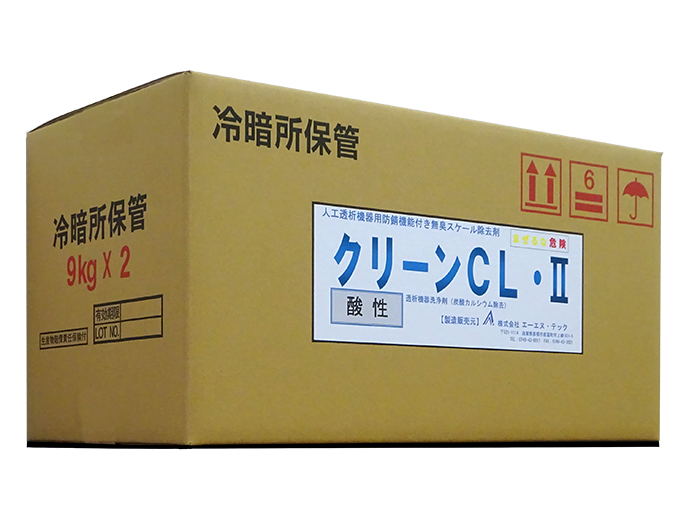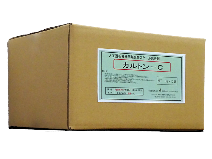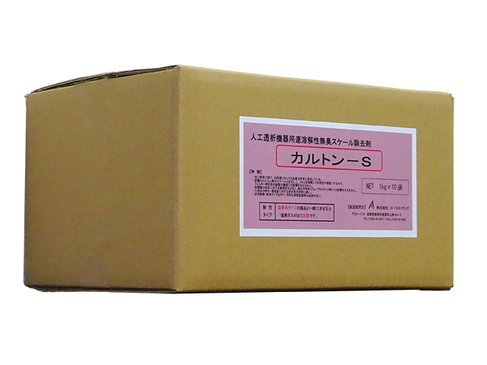 粉末タイプであるカルトンCはRO水で溶解することにより、強酸性(pH2.4~2.5)となり、透析装置や透析ラインに付着した炭酸カルシウムを除去する無臭性の酸洗浄剤です。